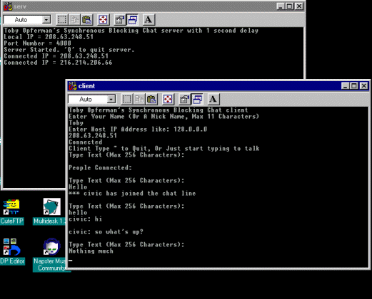 This is my first sockets program. It is a Win32 Console application. It has a server, which one person starts up, then everyone connects to him. You just type to chat, hit enter to send. Hit ~ to disconnect. Very Very simple program. There is no limit on the number of people who can connect. And the bandwidth should be really low, it just sends text. I haven't tried more than 5 or so people, so I don't know how the program works with a lot of people. It is a console application and the screen isn't very big, so large number of people would not be too great as the chat would scroll too fast. The source code is also available on this site.