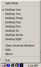 Allows multiple desktops on your computer providing a clean taskbar for each computer. There are hot keys that you can use to switch between desktops (Control + Alt + Left/Right Arrow) or you can use the System Tray Menu. Good for uncluttering the taskbar. Also has support for "Safe Mode" which protects against hung applications (Doesn't lock up Multidesk 2001 if an application is hung) and also supports Universal Windows (CONTROL + ALT + UP/DOWN ARROWS) which is the ability to have a window on all desktops. It also allows you to move windows to different desktops as you can drop windows off on any desktop. Multidesk 2001 was rewritten from scratch separating the engine from the UI. It also has the ability for advanced users to set their own hot keys. There is also an option to get the source code for multidesk 2001 for personal use and personal modification of multidesk 2001. * Read the help file for further information. *